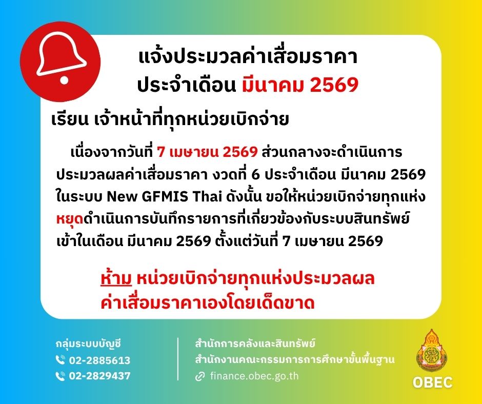 แจ้งประมวลผลค่าเสื่อมราคา งวดที่ 6 ประจำเดือนมีนาคม 2569