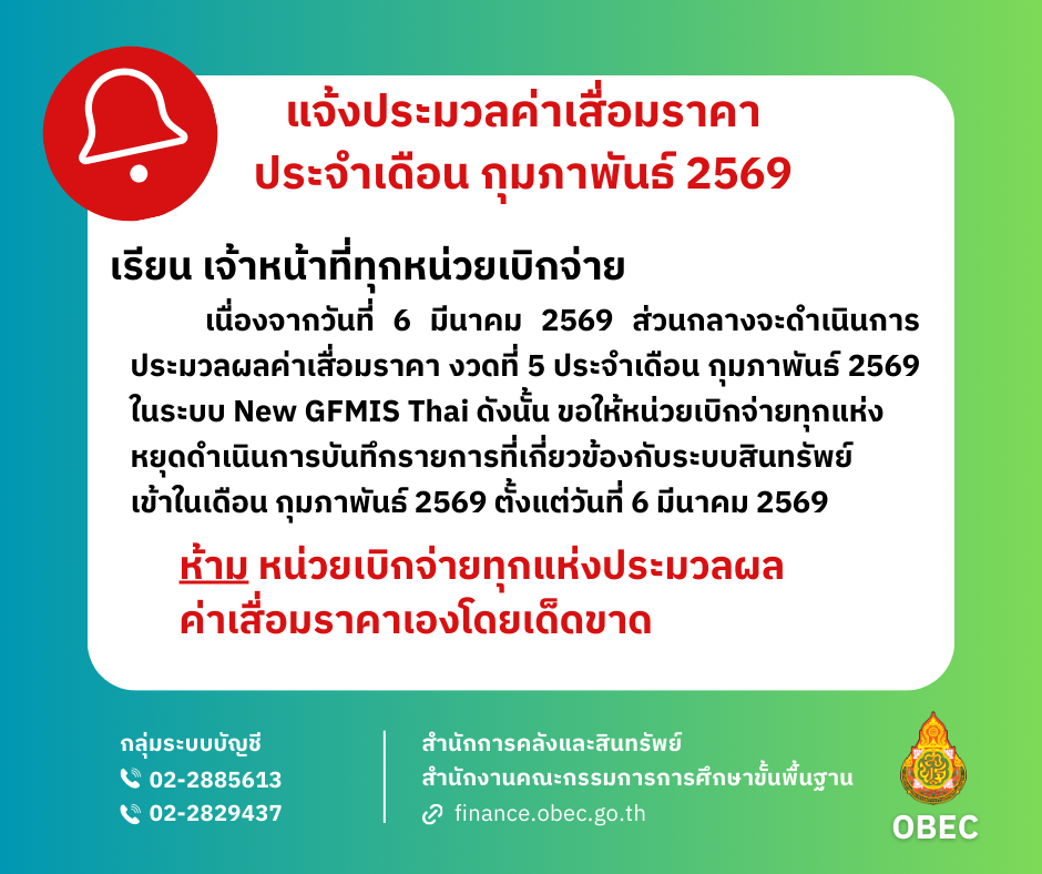 แจ้งประมวลผลค่าเสื่อมราคา ประจำเดือนกุมภาพันธ์ 2569