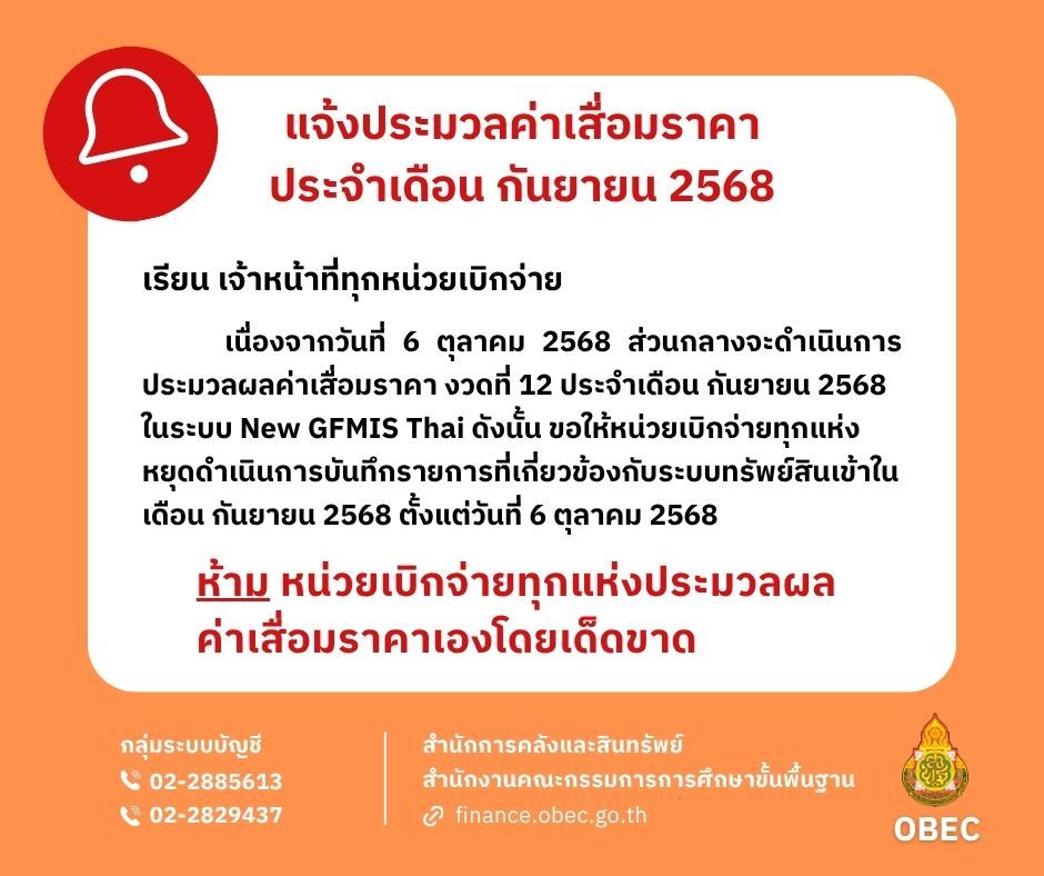 แจ้งประมวลผลค่าเสื่อมราคา ประจำเดือนกันยายน 2568